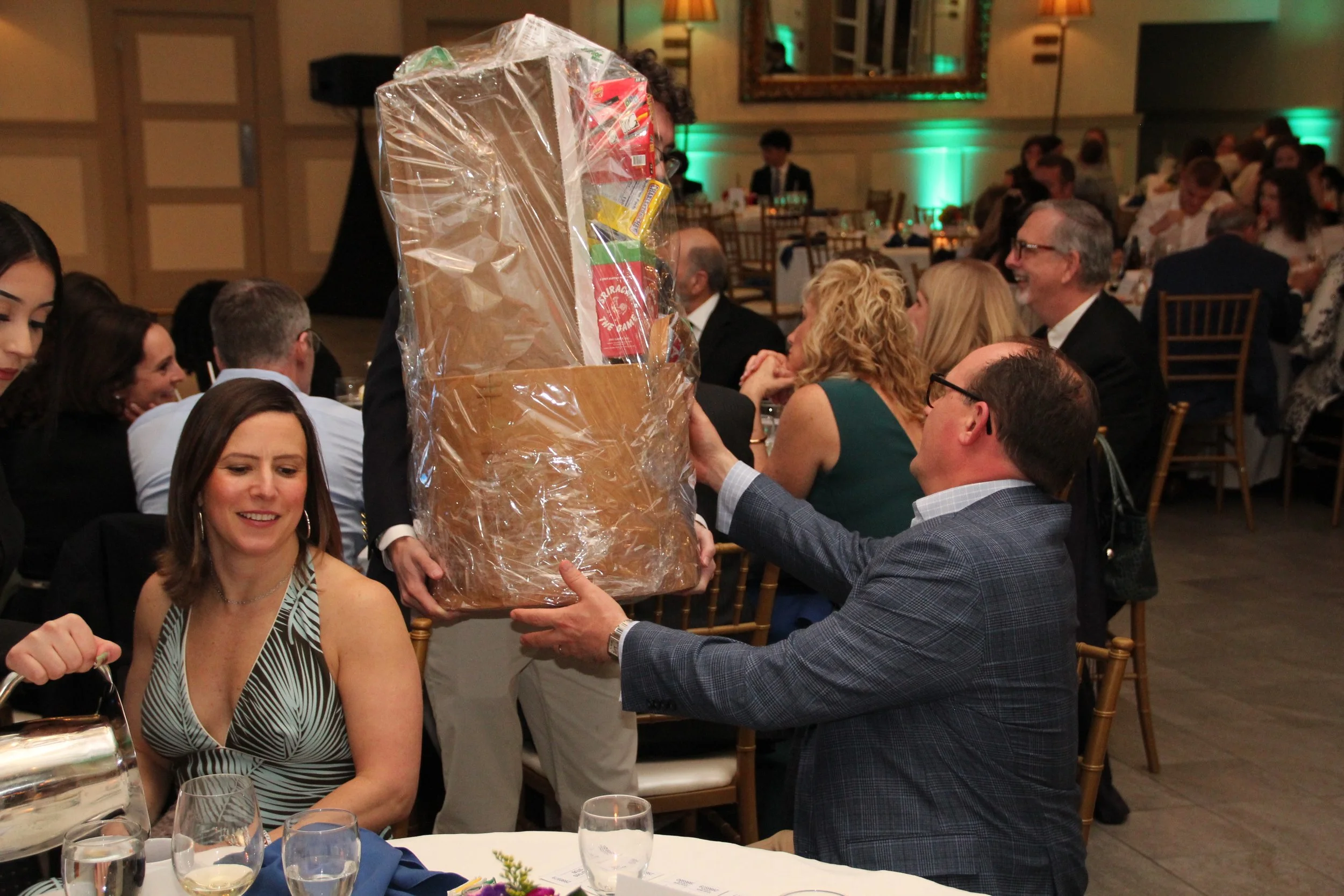 Multiple gift baskets and gift bags decorated with clear wrapping, placed on a wooden table with informational cards and white paper gift bags hanging below.